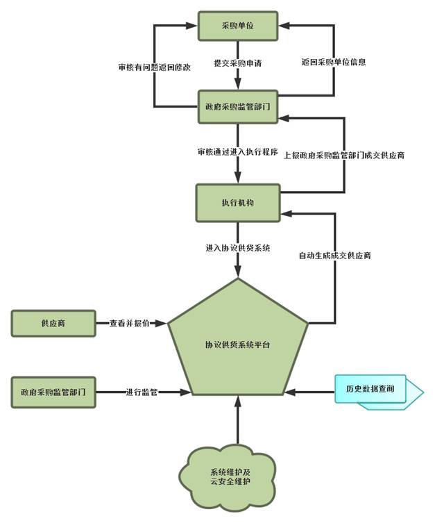 二、采購系統(tǒng)進(jìn)行流程 本系統(tǒng)在發(fā)生采購需求時(shí),各級(jí)采購單位應(yīng)將業(yè)務(wù)需求、技術(shù)規(guī)格、售后服務(wù)、采購數(shù)量、采購預(yù)算金額等內(nèi)容上報(bào)給政府政府采購管理辦公室,由政府政府采購管理辦公室交由執(zhí)行機(jī)構(gòu)統(tǒng)一錄入進(jìn)本系統(tǒng),由本系統(tǒng)進(jìn)行自動(dòng)項(xiàng)目編號(hào),