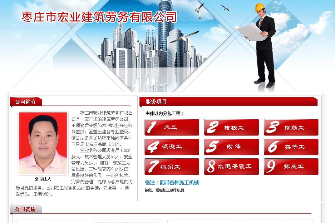 棗莊市宏業(yè)建筑勞務(wù)有限公司是一家正規(guī)的建筑勞務(wù)公司,主項(xiàng)資質(zhì)等級(jí)為木制作業(yè)分包勞務(wù)壹級(jí),涵蓋土建各專(zhuān)業(yè)壹級(jí)。 該公司是為了適應(yīng)市場(chǎng)經(jīng)濟(jì)條件下建筑市場(chǎng)發(fā)展而成立的。 宏業(yè)勞務(wù)公司現(xiàn)有員工300多人,技術(shù)管理人員30人,安全管理人員6人,擁有一支施工力量雄厚、工種配套齊全的隊(duì)伍,具備良好的作風(fēng)、一流的技術(shù)、完善的管理,能夠?yàn)榭蛻?hù)提供優(yōu)質(zhì)可靠的服務(wù)。公司在工程承包方面的承諾:安全第一、質(zhì)量?jī)?yōu)先、工期保時(shí)。